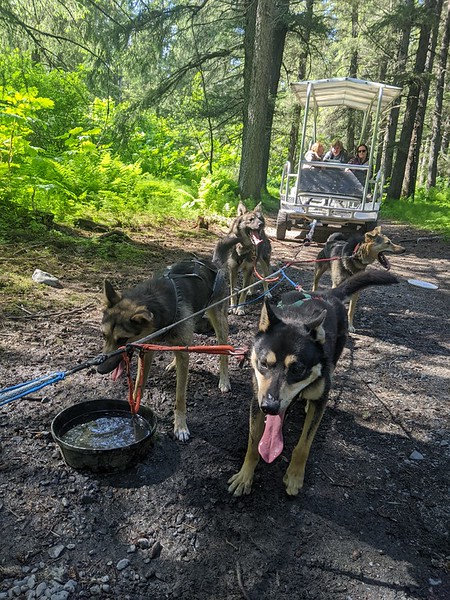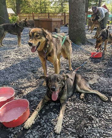 The dogs ‘weight train’ during the summer months pulling tourists. No more than 500(ish) pounds for them to pull at 2~ish miles for the demo. Endurance training beginning in fall involves a quick ramp up of 10 to 20, then 50 miles and so on in order to be in shape for the racing season starting in January. The 1000 mile Iditarod Race from Anchorage to Nome usually takes place in March.